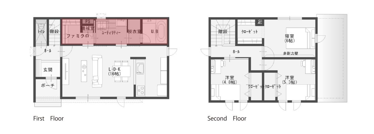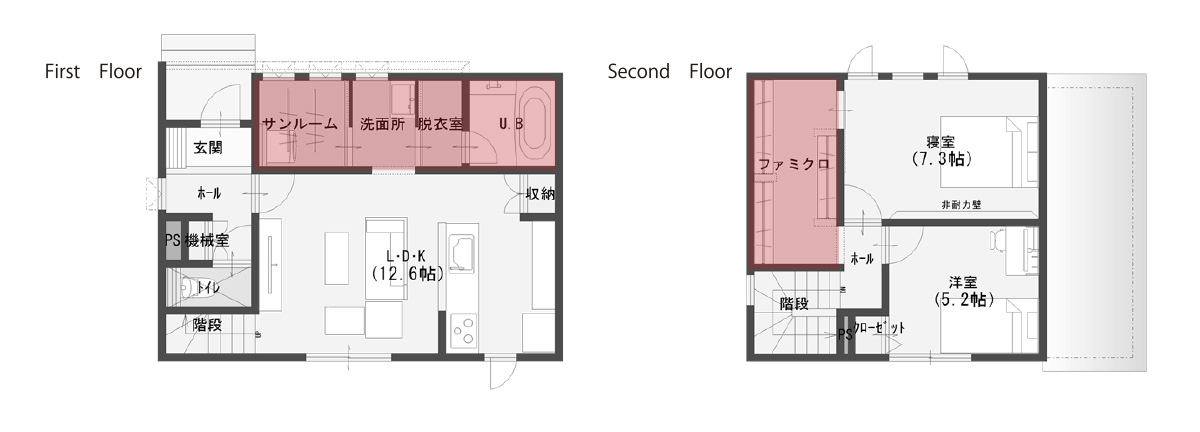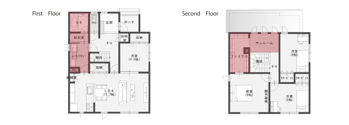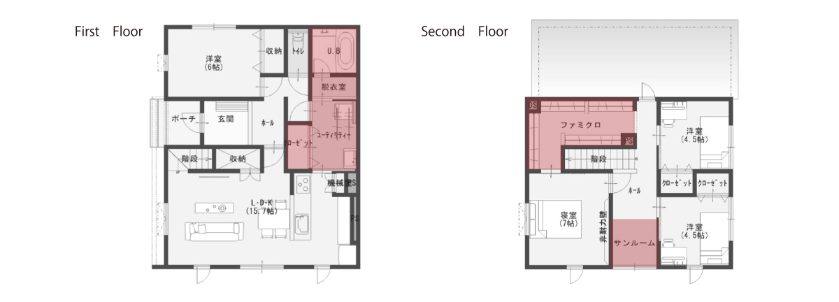 単独脱衣室が嬉しい、サンルームにもなるユーティリティのあるプランです。