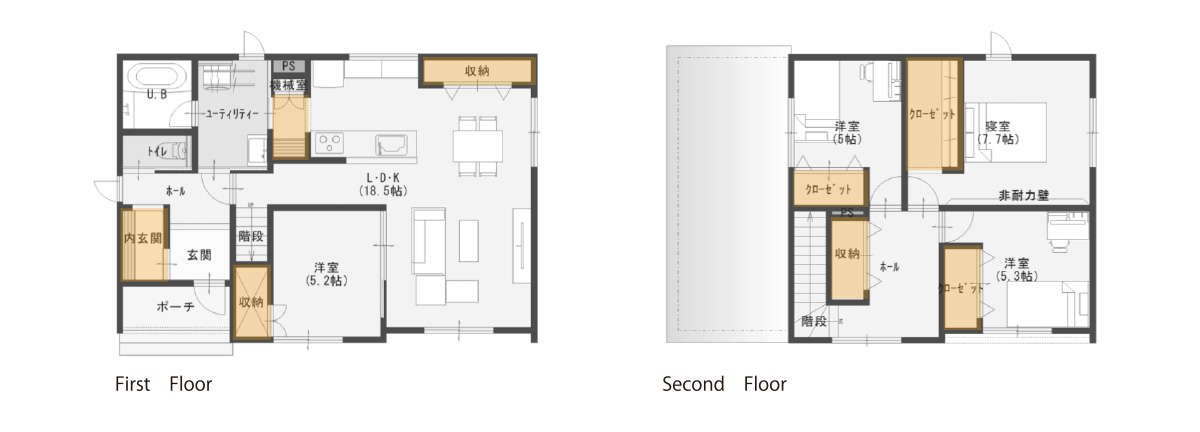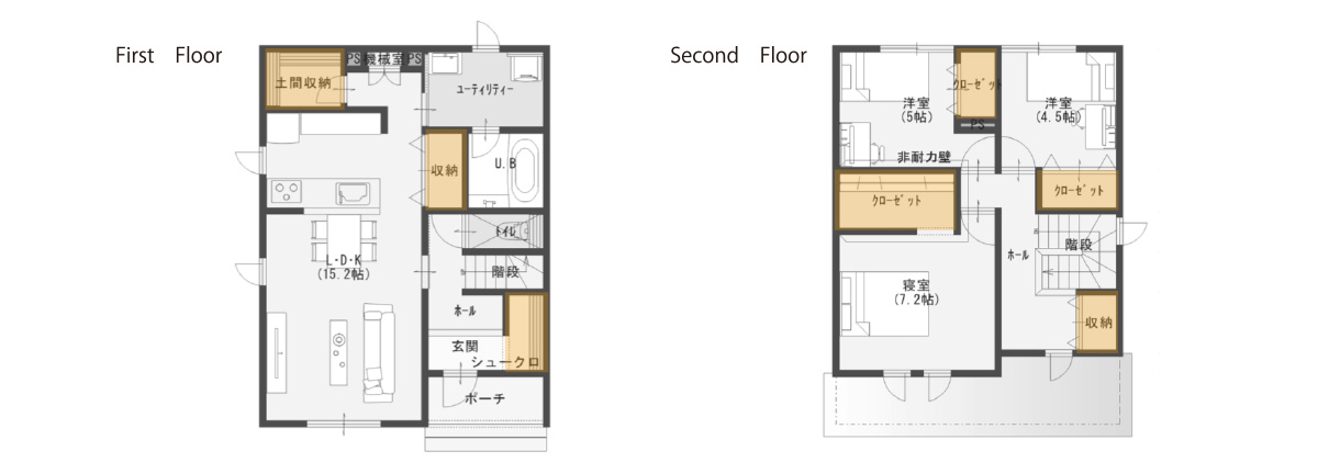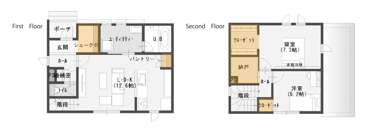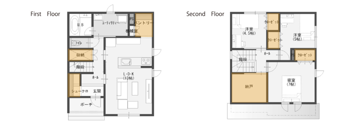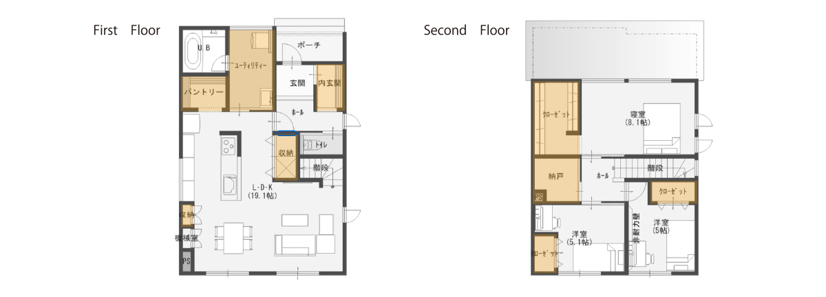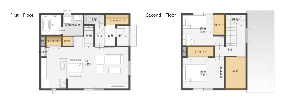 コンパクトな中に収納を充実させたシューズクロークやパントリー、納戸のあるプランです。