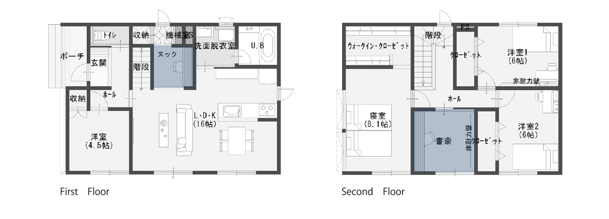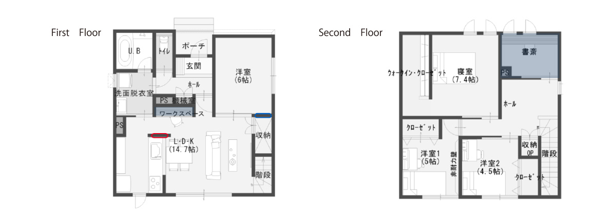 となり合わせのワークスペースと書斎のある、個の空間が充実したプランです。