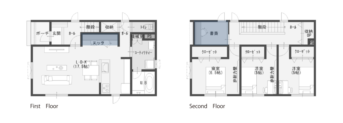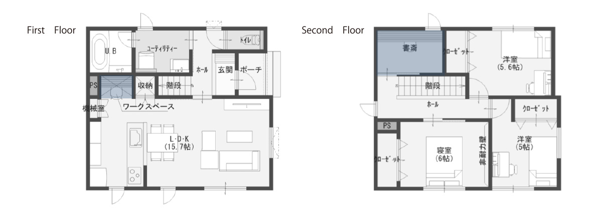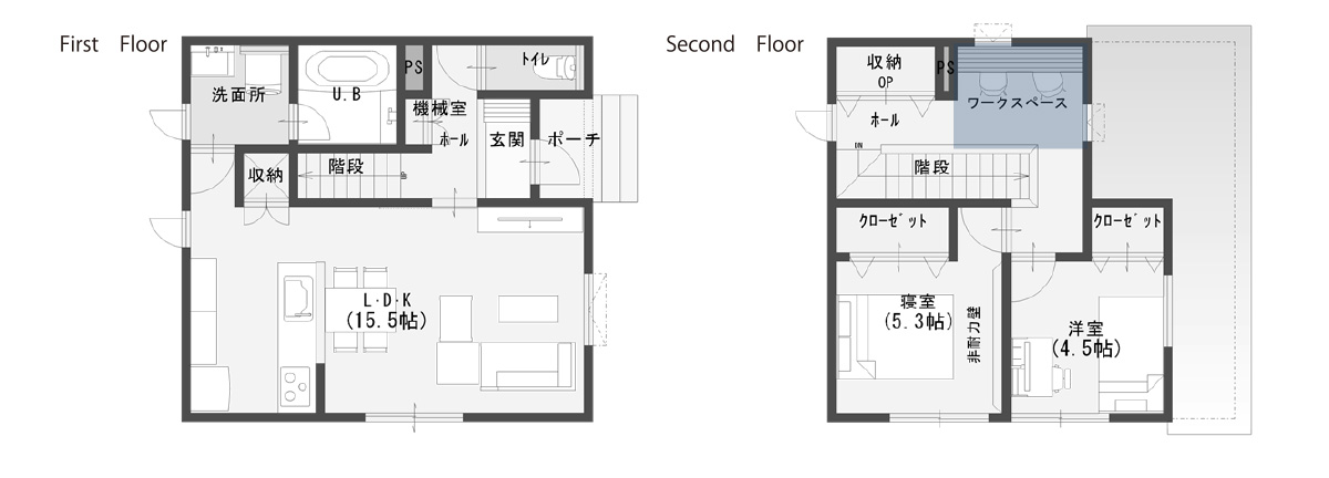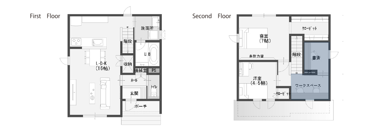2階ホールにワークスペースのあるコンパクトな2LDKプランです。