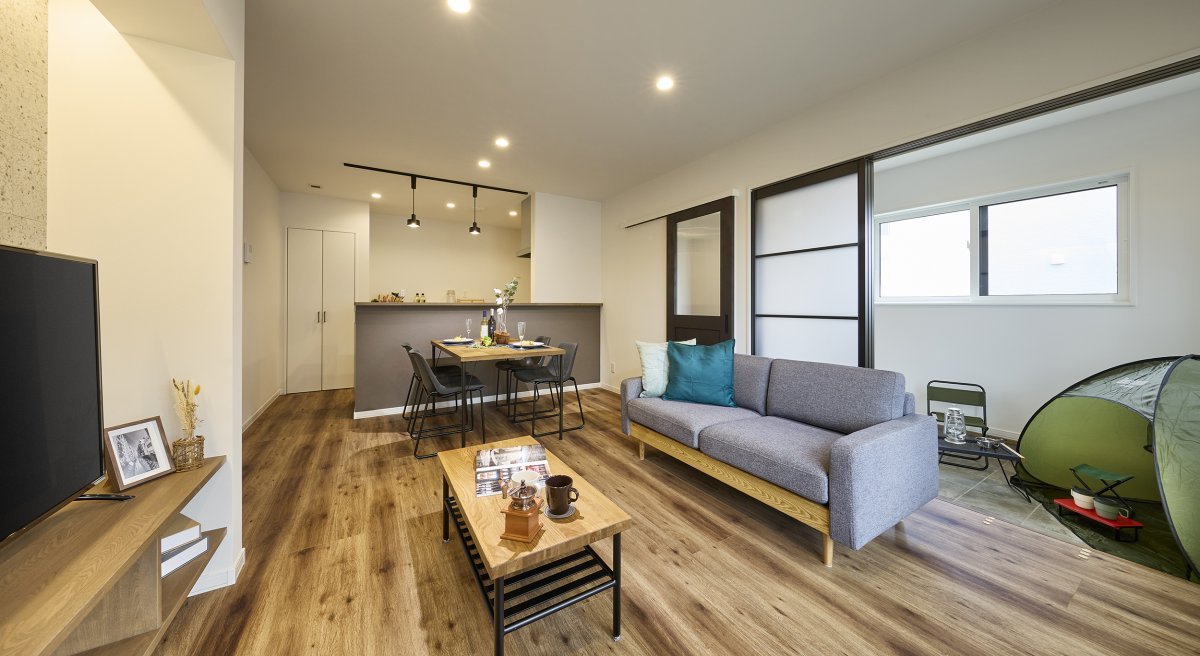 造作TVステーションが目を惹くヴィンテージテイストのインテリア