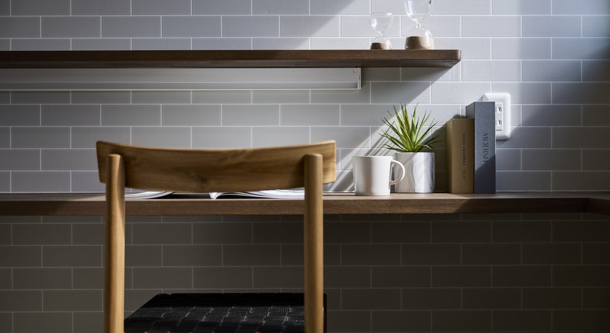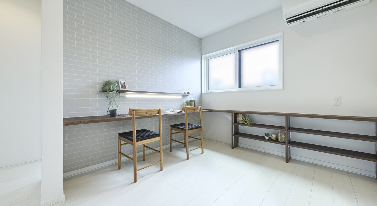 書斎としても利用できるアクセントクロスをあしらったカウンター付きフリースペース