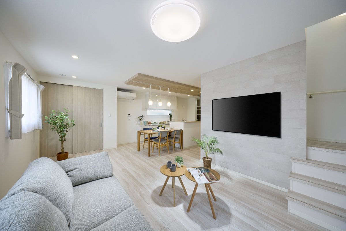 壁掛けテレビを設置したアクセントウォールが、お部屋の印象をよりスタイリッシュに引き締めます。