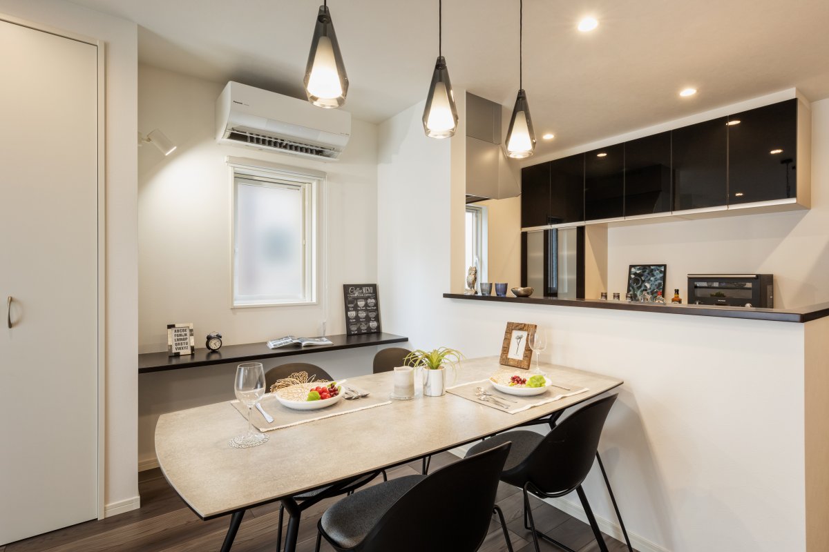 濃い色のキッチンカウンターが、シックな印象を与えるダイニング&キッチン。