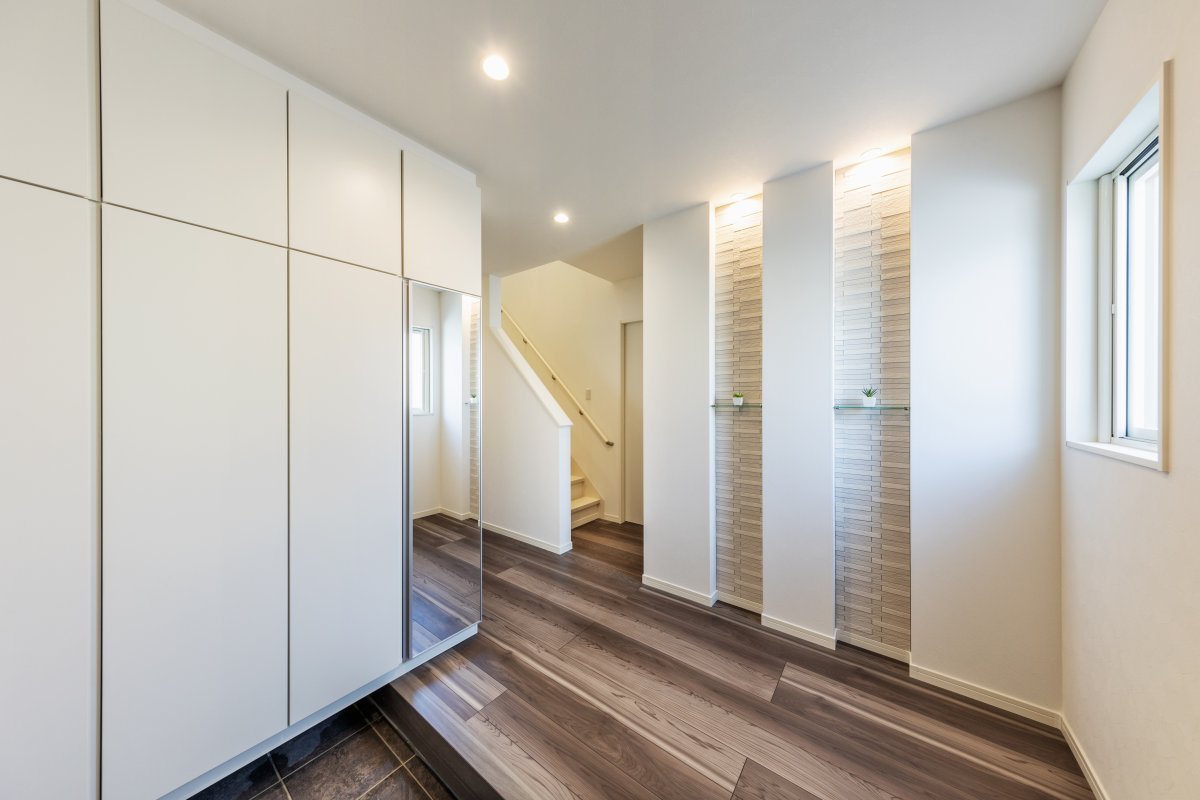 玄関を入ると、大容量のホワイトキャビネットが。