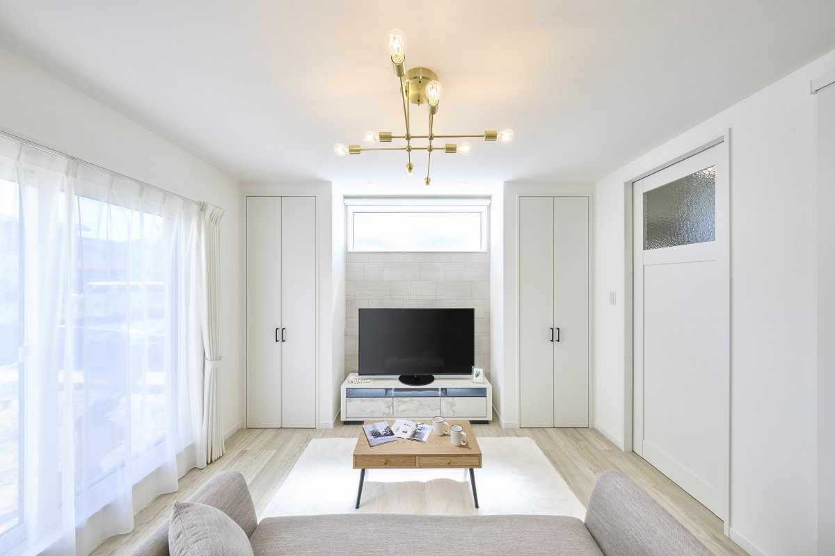 TVコーナーにはタイル柄のアクセントクロスをあしらい、空間にさりげない個性をプラス。