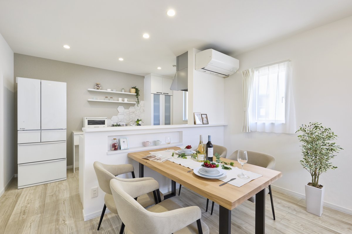 ダイニングはキッチンと対面式で、家族の会話が自然と生まれる配置に。
