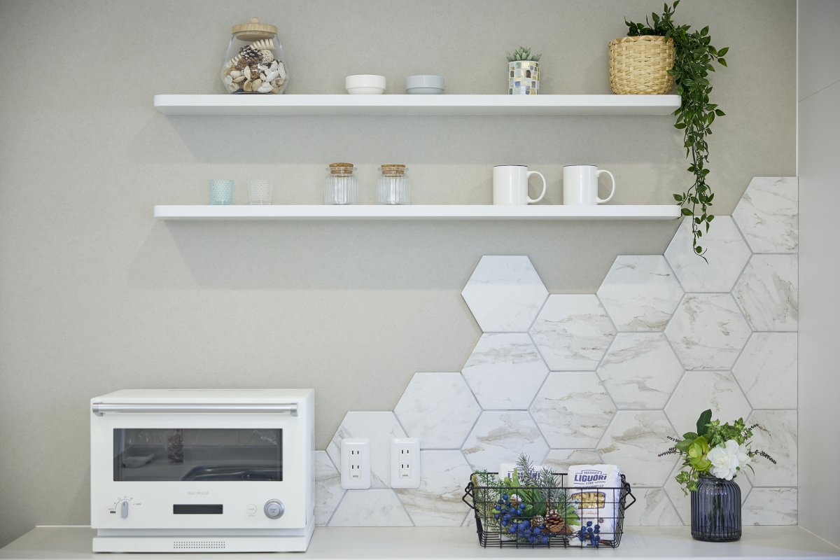 キッチン背面には造作の飾り棚を設け、自然石風のヘキサゴンタイルが空間のアクセントに。