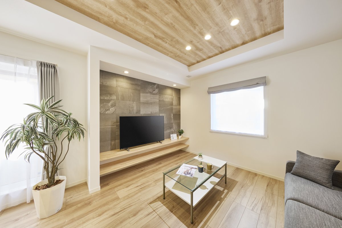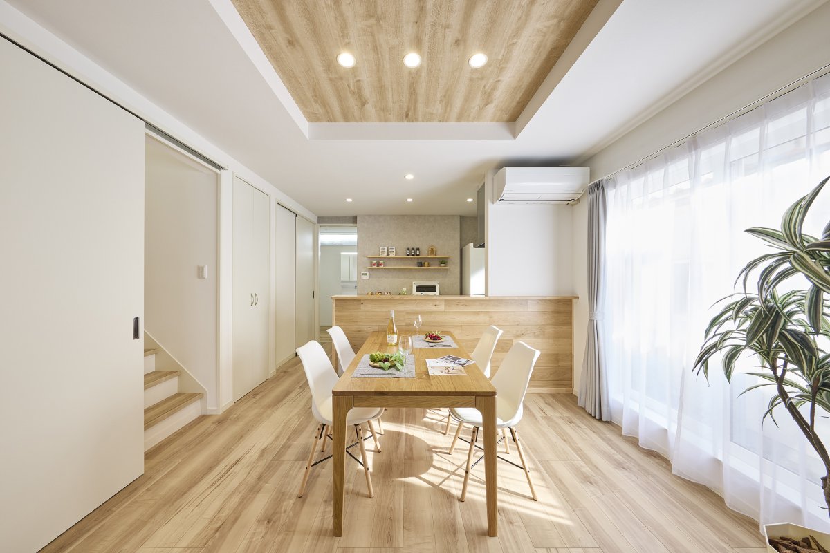 木目調の折り上げ天井が印象的なLDKは、ホワイト×木目で統一されたナチュラルテイストの空間に。