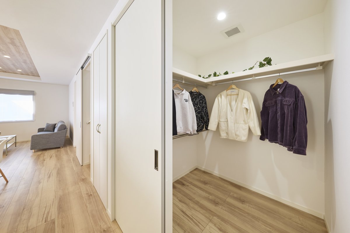 大容量の収納で、家族みんなの衣類や日用品をまとめて管理でき、家事動線にも配慮した使い勝手の良い間取りです。