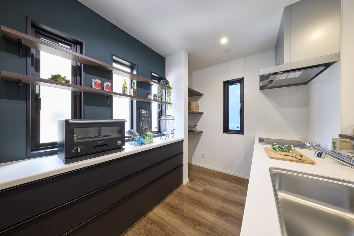 キッチンはブラックを基調にまとめ、グリーンのアクセントクロスとのコントラストで引き締まった印象に。
