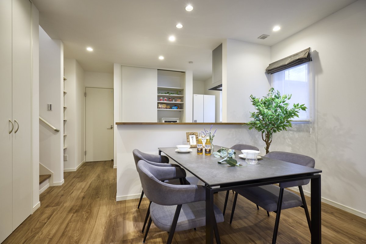 ダイニングはキッチンと向かい合わせ配置で、すぐ横に階段を設けることで家族の動きが自然と交わる間取りに。