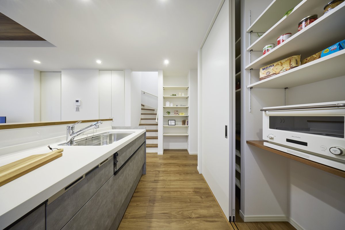 飾り棚で見せる収納も楽しめ、横にはパントリーを備えることで、使い勝手と収納力の両方を兼ね備えています。