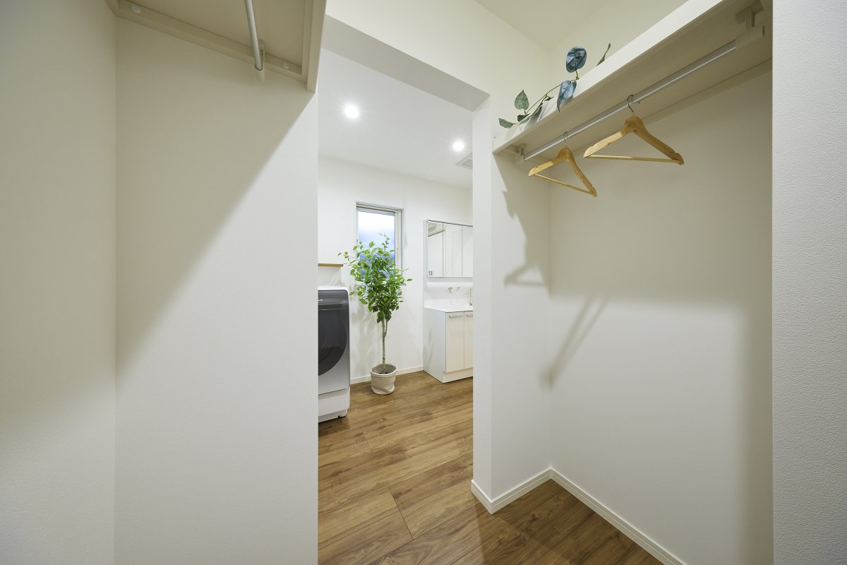ユーティリティーに隣接したファミリークロークは、洗濯から収納までの動線がスムーズに。